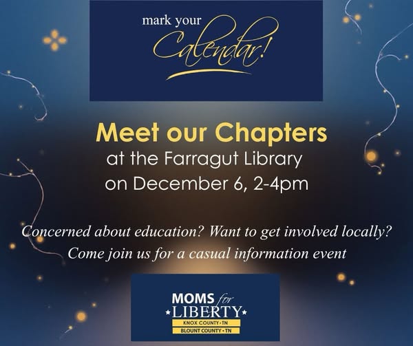 Knox County Moms for Liberty Meet and Greet Saturday December 6 at 2pm. Refreshments will be served. Stop by for a few minutes!