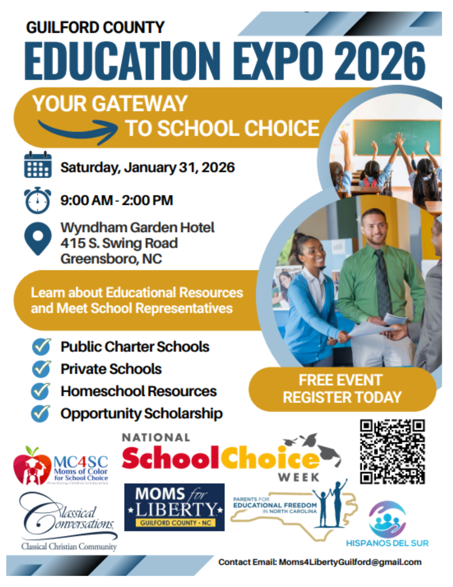 On Saturday, January 31, 2026, Moms for Liberty Guilford County will host a School Choice Education Expo at the Wyndham Garden Hotel in Greensboro, featuring local charter, private, and homeschool exhibitors, as well as expert-led breakout sessions. This event is open from 9:00 AM to 2:00 PM and is free to the public.